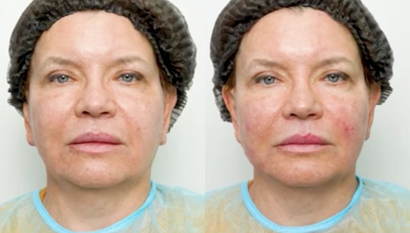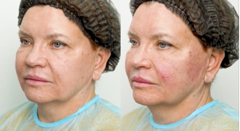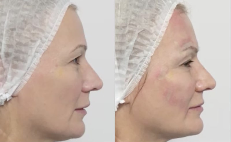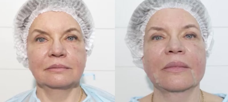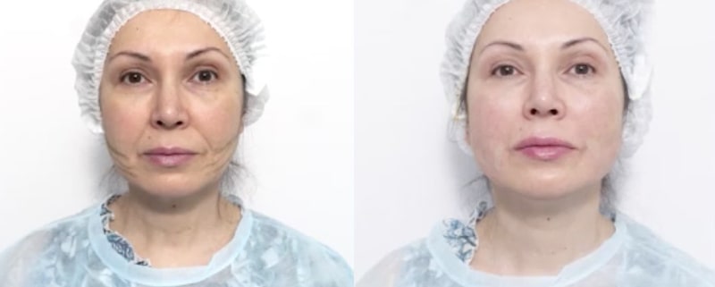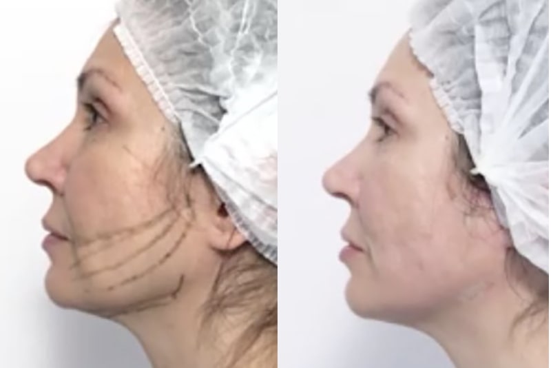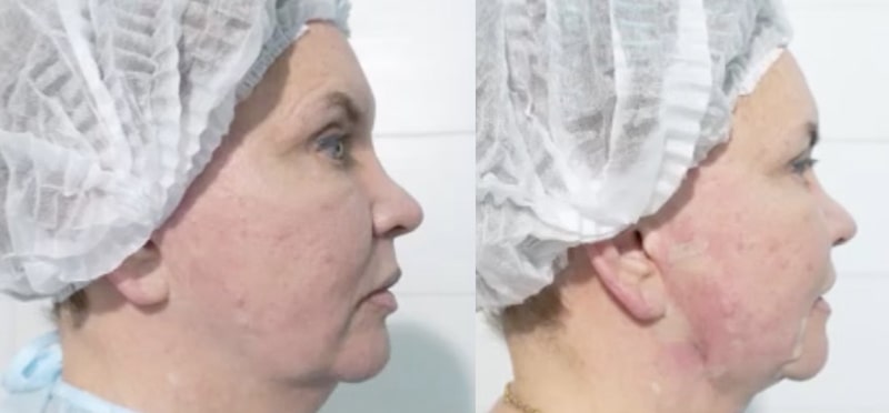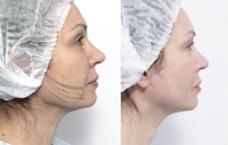 Наблюдаются фиксация перемещения тканей в нижней трети лица, создание более чёткого контура нижней челюсти, сглаживание носогубного угла.