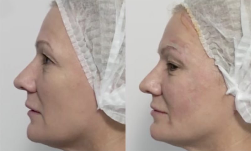 Нити были установлены от скуловой связки до носогубной складки, от козелка уха до губнокраевой складки и ниже септы носогубной борозды от основания носогубной складки до крыла носа с целью перемещения тканей в средней и нижней третях лица от центра к периферии, а также для сглаживания носогубного угла и формирования более чёткого овала лица.